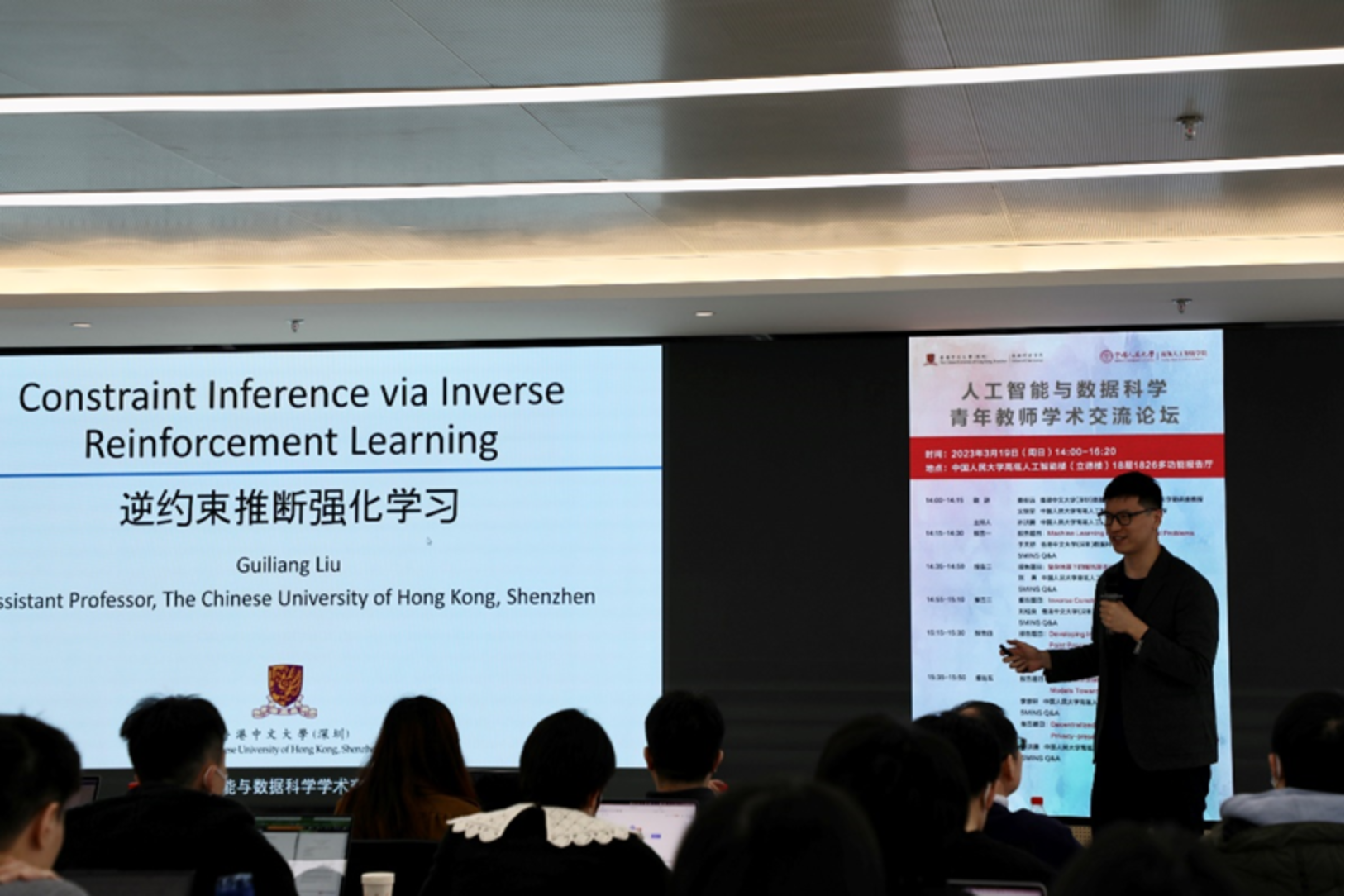香港中文大学(深圳)数据科学公司助理教授刘桂良的报告围绕逆约束强化学习展开,他指出人们在将强化学习应用到许多现实场景(如自动驾驶)时,往往需要在一定的约束条件下最优化学习策略,但在许多情况下约束是不可知的。为此,刘桂良老师介绍了如何从数据中反向推断出所需要的约束从而实现逆约束强化学习,并分享了他们在逆约束强化学习方面的一些研究成果。