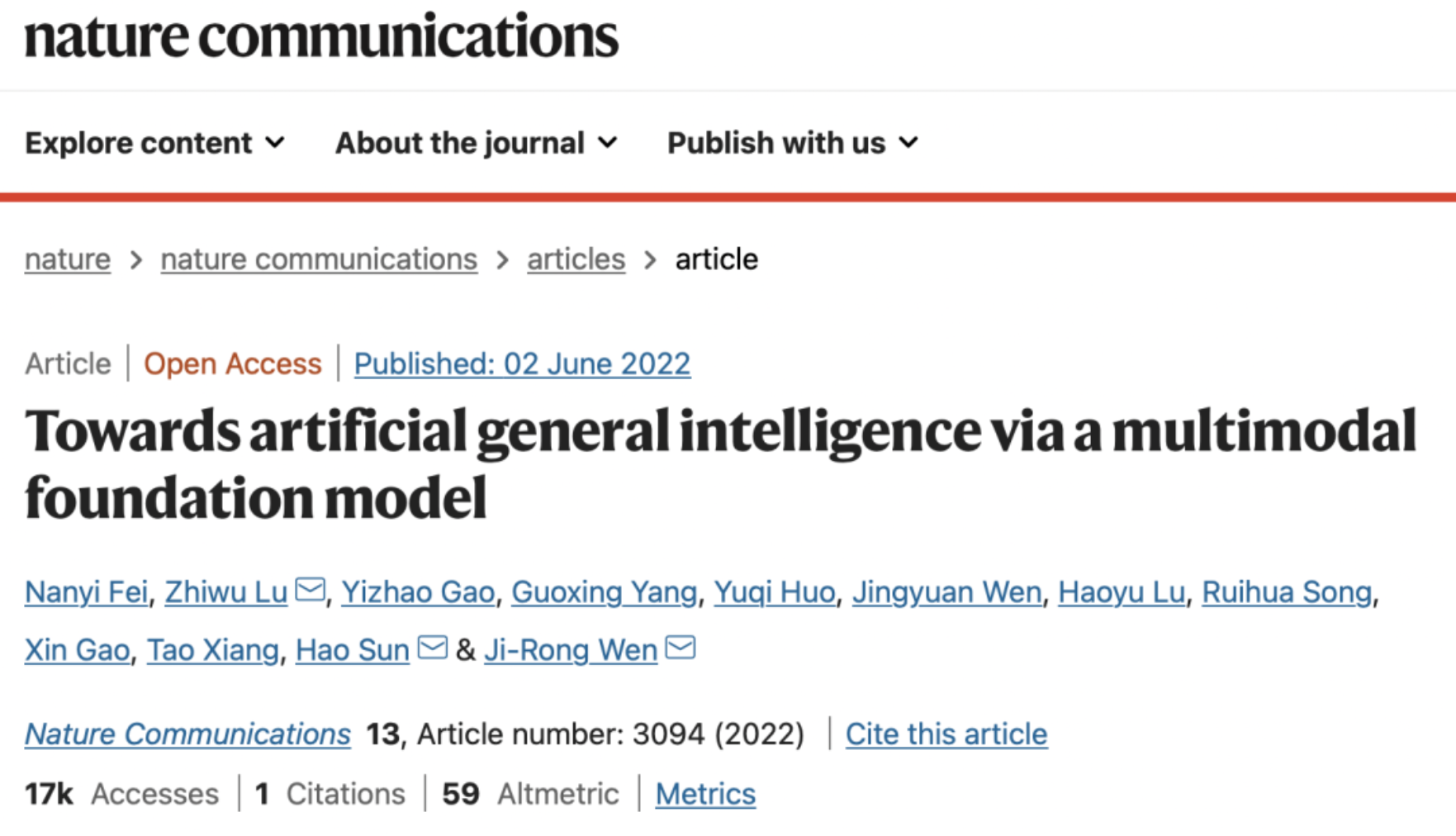 党的二十大报告指出,“创新是第一动力”。今年6月,由文继荣牵头的“文澜”团队论文“Towards Artificial General Intelligence via a Multimodal Foundation Model”登上Nature 子刊《自然·通讯》。团队成员通过“观察”人类大脑处理多模态信息的机制,提出文本与图片之间的弱语义相关假设,赋予了模型足够的想象能力和泛化能力,从而帮助人工智能应用快速有效应对各类认知任务。“(纯粹)多模态工作登上 Nature 子刊,在业界尚属首次,这是大模型项目力争世界领先的努力成果,也是多模态迈向通用人工智能这一研究方向的重要进展。”对于该工作的意义,304永利集团教授卢志武如此介绍。