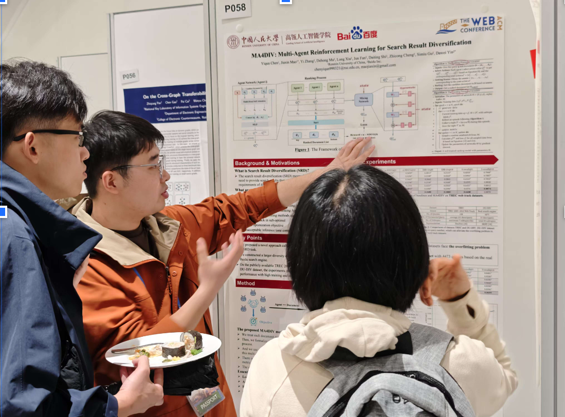 博士研究生陈逸群作为第一作者,在WWW 2025的IR相关的session做了 MA4DIV: Multi-Agent Reinforcement Learning for Search Result Diversification 和 TourRank: Utilizing Large Language Models for Documents Ranking with a Tournament-Inspired Strategy 两篇论文的报告。他说:“认识了很多新朋友,有了一些新的科研上的观点。”