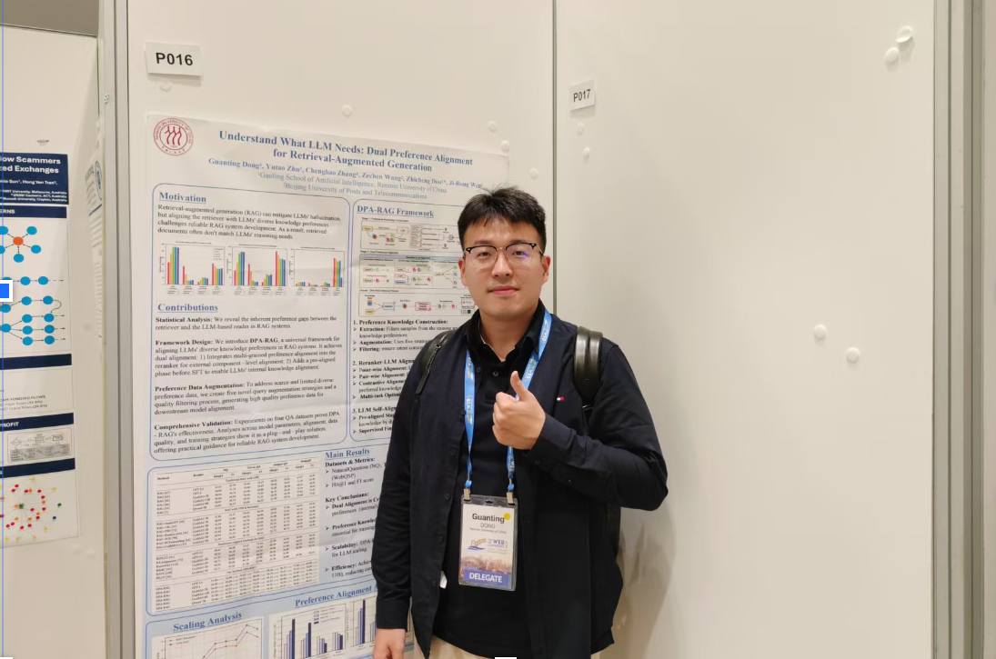 博士研究生董冠霆作为第一作者去WWW 2025 Posterboard-16讲解了他的DPA-RAG论文。他说:“在出国交流期间,我分享了关于DPA-RAG的研究工作,探讨了如何对齐大模型与检索器的知识偏好。交流过程中,我结识了国内外AI信息检索领域的多位研究者,包括来自阿里巴巴、蚂蚁集团、Google、新加坡国立大学(NUS)等机构的专家,借此了解到当下前沿的AI研究方向,进一步拓宽了自己的科研视野。”