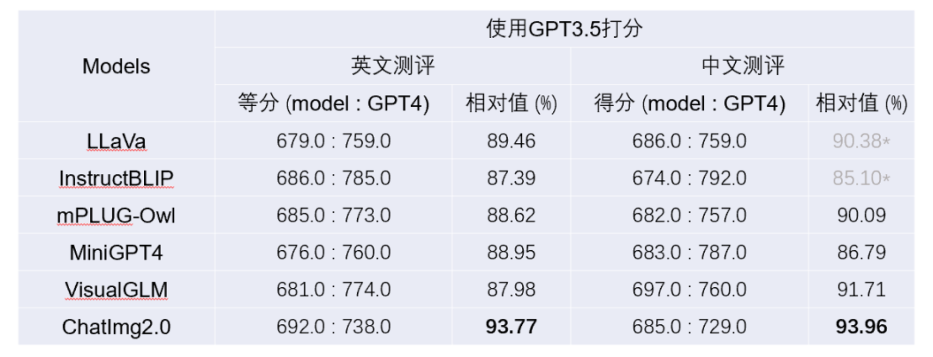 在公开的多模态对话数据集(LLaVa)上的评测结果,表明ChatImg2.0显著超过了众多的开源模型。具体地,我们采用如下打分方式:给定90个问题,将问题、图像描述、待测模型回答结果和GPT4回答结果一起输入GPT3.5,让GPT3.5对比两个回答,分别给出分数(0-10分),最终为90个问题上的总分。详细的多模态对话评测结果见下表: