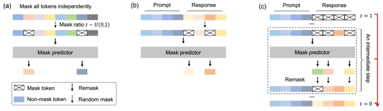 (图 2:LLaDA 的三个核心阶段:(a)预训练,为模型注入世界知识。(b)有监督微调,训练模型遵循人类指令。(c)采样。从完全掩码的回复内容到无掩码的去掩码过程。)